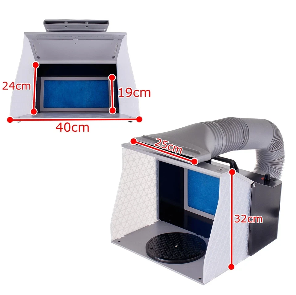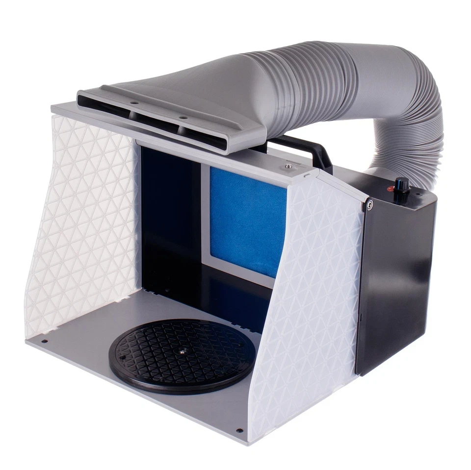 Kabina za prskanje je kompaktno, efikasno i mobilno rješenje za sigurno lakiranje aerografom. Neophodna je za modelare, umjetnike, hobiste i DIY entuzijaste. Štiti korisnika od udisanja štetnih para i smanjuje širenje maglice boje, osiguravajući ugodne uslove rada kod kuće ili u radionici.