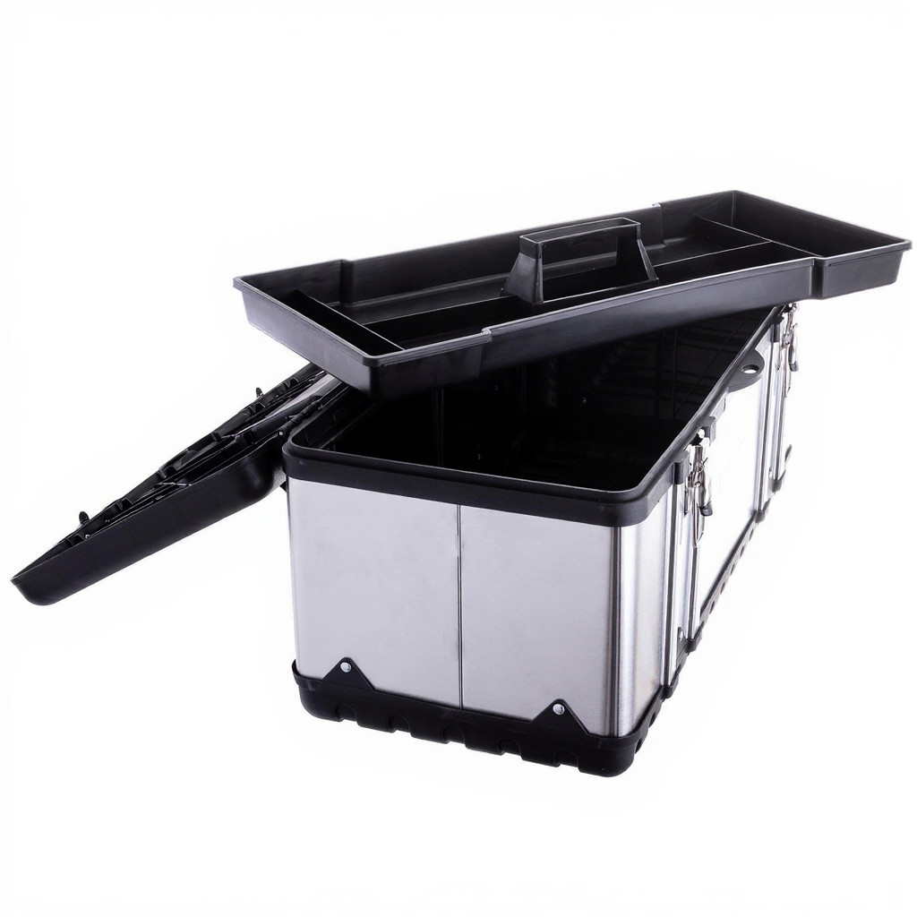 Visokokvalitetna skrinjka za alat izrađena od nehrđajućeg čelika i ABS plastike, namijenjena sigurnom i urednom čuvanju alata.