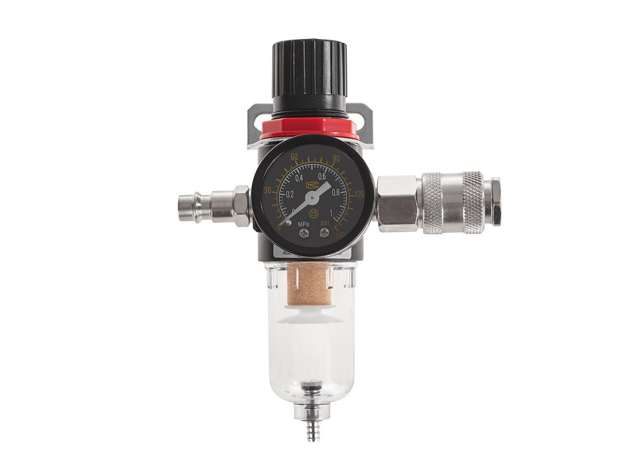 Dehidrator zraka sa filterom za zrak i regulatorom opremljen standardnim priključkom za ulaz zraka od 1/4”. Uređaj je dizajniran za pročišćavanje dolaznog zraka od većine tekućih i čvrstih čestica. Ima regulator pritiska koji omogućava glatko podešavanje izlaznog pritiska zraka u rasponu od 0 do 150 PSI.