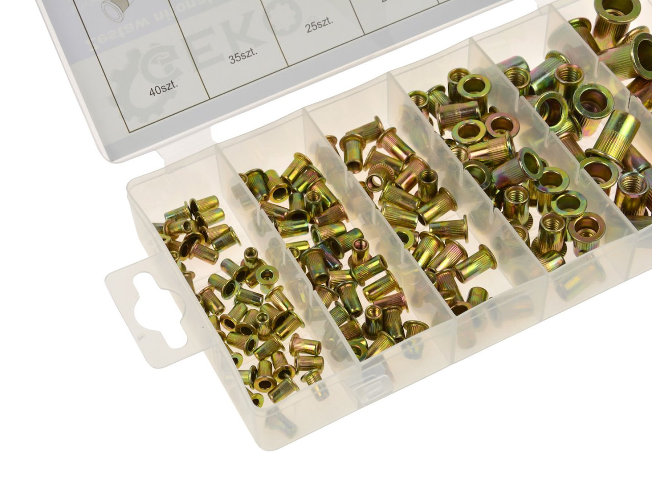 Asortiman od 150 čeličnih zakovnih matica u 6 popularnih veličina M3 – M10. Kompatibilno sa spojnicama odgovarajuće veličine navoja.