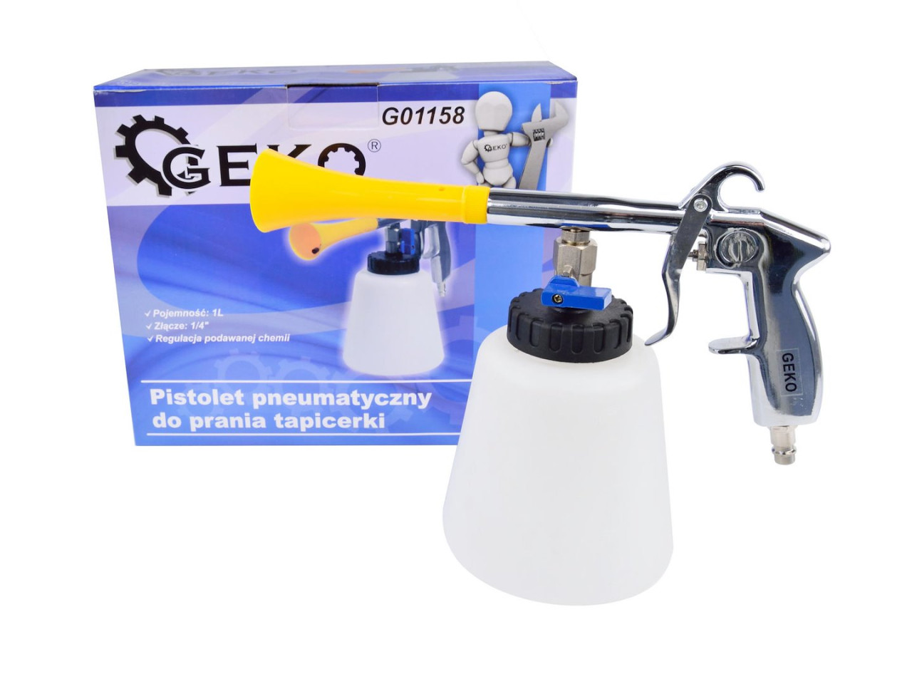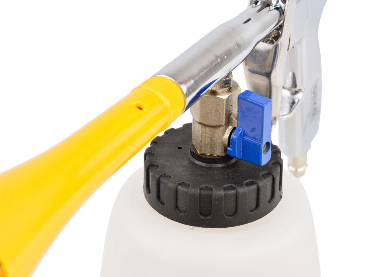 Pištolj za čišćenje zrakom sa spremnikom odličan je alat za čišćenje i uklanjanje prašine i mrlja s teško dostupnih mjesta kao što su vodilice sjedišta, obloge vrata, kontrolne ploče, tapacirani dijelovi, pa čak i karoserija. Koristi se s kompresorom.